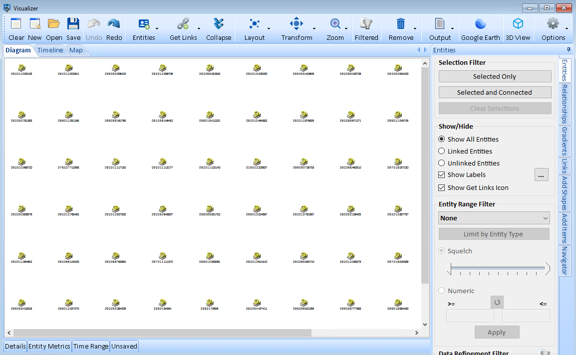 4. To only view the phones connected to targeted phones, click the [Entities] tab and select 'Linked Entities' in the Show/Hide panel. These are the most suspicious phones in your database.